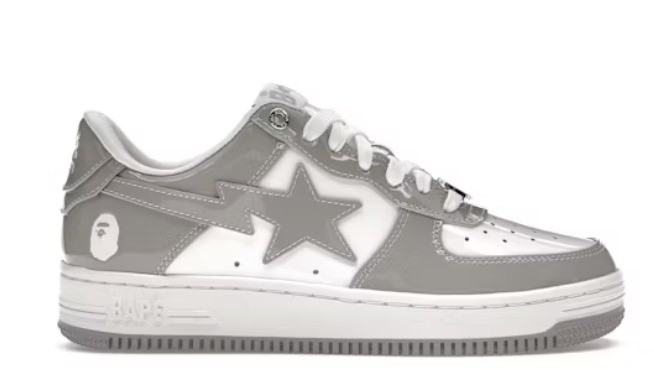 يأخذ حذاء A Bathing Ape Bape Sta Patent Leather White Gray صورة ظلية مميزة منخفضة القمة من العلامة التجارية اليابانية الرائجة لملابس الشارع ويلبسها بألوان رقيقة تتألق.