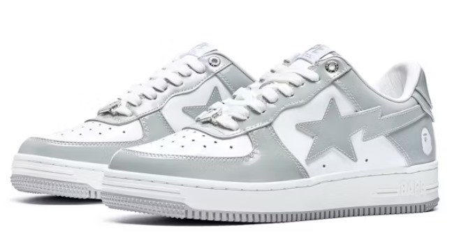 يتميز حذاء A Bathing Ape Bape Sta باللون الأبيض والرمادي. تضيف طبقات الجلد الرمادي اللامع لمعانًا لأنها تزين الجزء العلوي وتصنع شكل النجم المطلق. تتطابق الأربطة البيضاء مع بطانة الجورب وعلامة Bape Sta التجارية الموجودة على شريط الكعب. شعار A Bathing Ape الذي يظهر باللون الأبيض على الكعب الجانبي وعلى شكل جوهرة من الدانتيل يكمل المظهر الكلاسيكي لهذا الجزء العلوي.